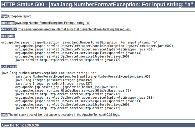 Looking on the TBS web pages we see that "basket.jsp" is a page that accepts an integer value like 0, 1, 2, 3, etc. But what will happen if we pass an invalid value like an alphabet to it?