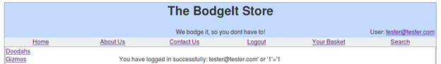 Here the "AND" keyword specifies that authentication succeeds only when the username and password of the user matches. We can inject an "OR" keyword to make our query true. For example, we send this as username: tester@tester.com' or '1'='1
