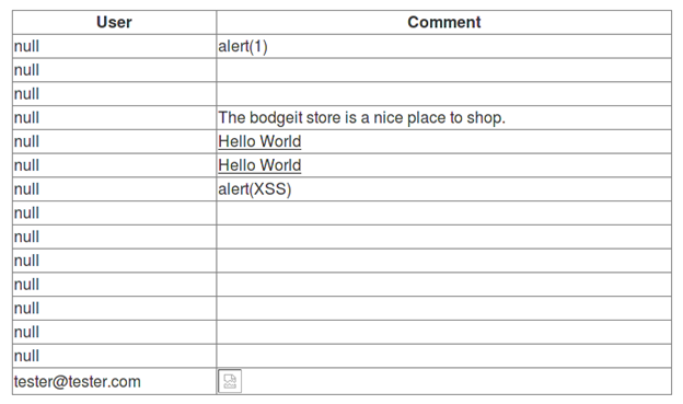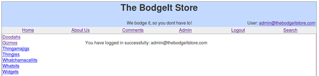After we have logged in to the admin account using the SQL injection vulnerability, we can see a hyperlink "comment" leading to http://10.0.0.2:8080/bodgeit/contact.jsp
