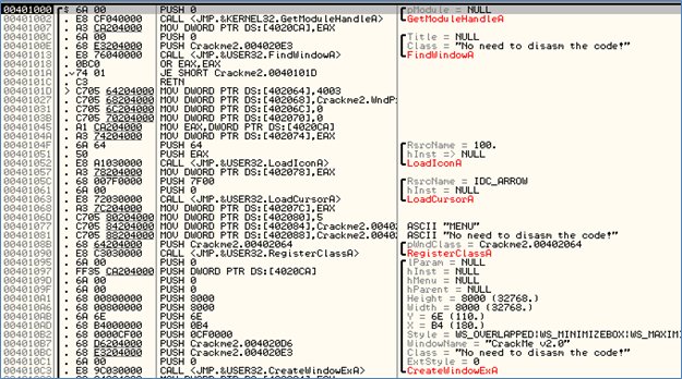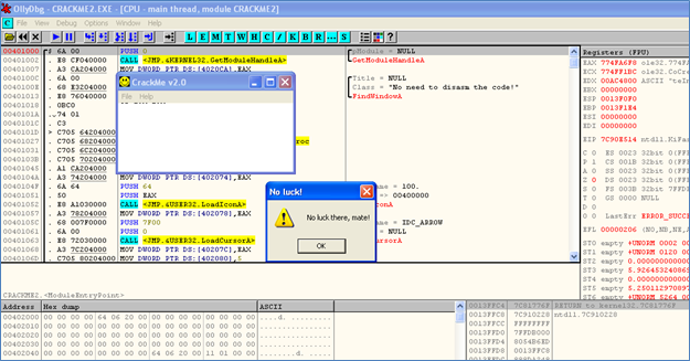 Now again, press CTRL+F2, this will reload the CrackMe2.exe into Olly (Fig-10). Once loaded, press F8 and step through the instructions to get an idea about the code. Olly lands at the following instructions:
