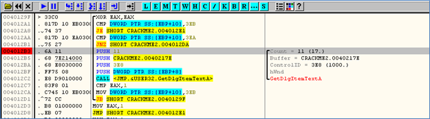 There are several APIs that are executed by them, such as, GetModuleHandleA, it returns the handle to the file of the current process. Similarly, few more APIs- FindWindowA, LoadIconA, LoadCursorA and CreateWindowExA which pretty much indicate that the exe being loaded and the icons and windows are being created. Similarly, ShowWindow and UpdateWindow are used to display a dialog box. But basically, what are we looking for is the API which actually takes the user input. Carefully going through the code window gives one API which seems to be a bit interesting: GetDlgItemTextA. We need to observe this very carefully because it's where we give the input and will capture the logic. We need to put a breakpoint, which pauses the execution there, for further inspection. So we press F2 to set the breakpoint where the function starts at 004012B3 (in Red) [Fig-11]:
