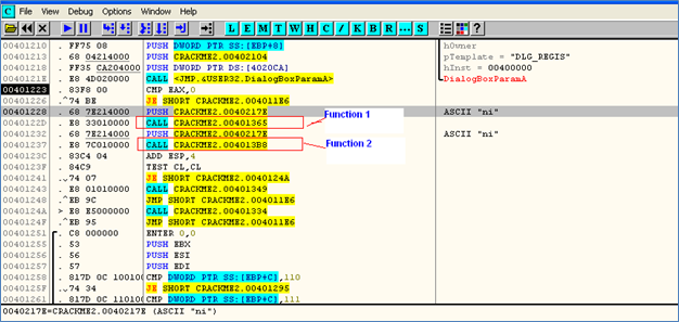 Now time to rerun the exe and catch at the breakpoint. Press CTRL+F2 to reload the app. Press F9 to run it, it will automatically come and halt at the set breakpoint. Now enter the password in the dialog box, I shall enter a two letter sample password 'ni' in the dialog box. As soon as we click 'OK', the execution halts at the breakpoint. Now it's is for the real observation of the code. Press F8 to step through each following instruction. Everything seems pretty normal as the code just accepts the input and traverse internally to some other address not directly related to main flow. I just keep pressing until it again return back to main execution flow. Where I can see the strings entered by me is being pushed (PUSH CRACKME2.0040217E) [Fig-12]. Just after pushing, two functions are being called. We will examine them one by one.