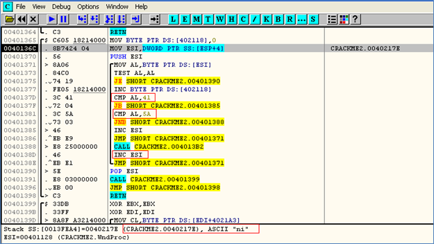 Let's examine Function1 at (CRACKME2.00401365). I press F7 to enter into the function [Fig-13]. The value ('ni') copied and being pushed using ESI. Now the instruction MOV AL,BYTE PTR DS:[ESI], taking the first letter 'n' from the value and copying to AL. Now AL is 'n' (6E), so TEST AL,AL is not zero (equivalent to cmp AL, 0), the jump is not taken and goes to next instruction INC BYTE PTR DS:[402118], which is for incrementing the counter. The next instruction CMP AL,41 compares 'n' (6E) with 41 (A). The flow goes to CMP AL, 5A and compares 'n' (6E) with 5A (Z), which probably checks if the value supplied is between A and Z. Since yes, the flow goes to CALL CRACKME2.004013B2, which is another subroutine.