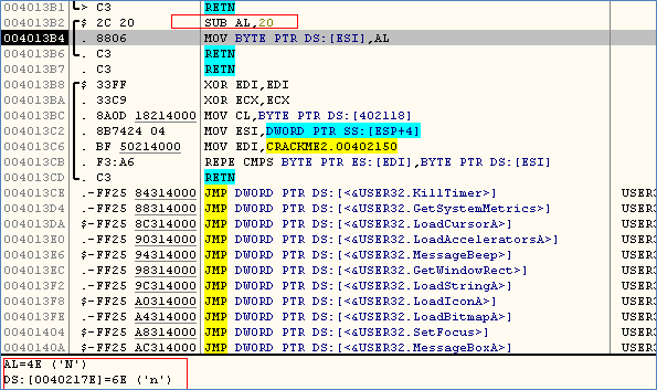 Carefully inspecting the code, it shows that it just converting lower case letters to upper case (SUB AL, 20) [Fig-14].