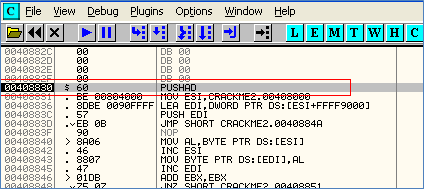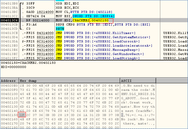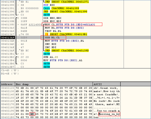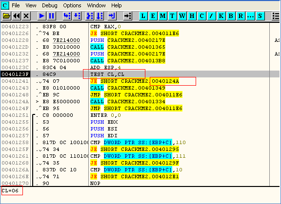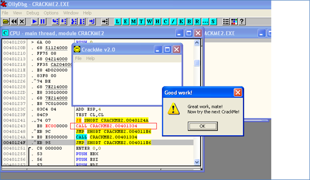 This approach talks about changing the flow of the execution so that whatever password is supplied, it's successful. No need to detect the correct password. So, here we go. Supply any random password ('IamHere'), keep pressing F8 until it comes back to the code as shown in Fig-12. Now the instruction TEST CL, CL checks if value of CL=0 (equivalent to cmp CL=0) [Fig-17]. Since here CL=06, the next instruction JE SHORT CRACKME2.0040124A is not taken and instead CALL CRACKME2.00401349 is executed, which takes us to message saying " No luck mate..". In order to get messages "Good work…" , we need to change the flow of the code. So, if we change the address 00401349 with 00401334, we change the instruction as CALL CRACKME2.00401334. Now this takes us to our goal, where we are finally greeted with "Good Work…" message!