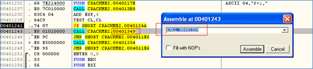 Highlight the CALL Crackme2.00401349 instruction, hit the SPACE bar on the keyboard and change the address to 00401334 then click Assemble (Figure-18). Now the code CALL Crackme2.00401349 gets replaced by CALL Crackme2.00401334.