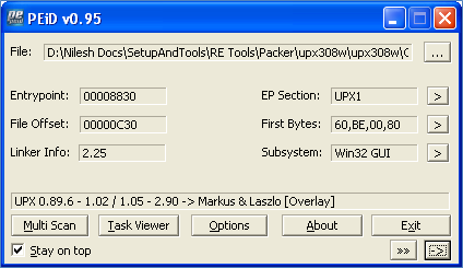 First, we need to identify the exe if it's a packed executable file. To confirm this we will use a tool called PEiD, which can really tell us if this is packed and if yes, using what packer. Launch the PEiD tool and locate the executable. You will see it displaying the information based on which tool it was packed with. [Fig-2].