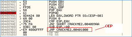 Once the EP is found, we need to look for the OEP, which is original entry point for the exe. We need to just keep scrolling until we find an instruction called POPAD, which is used to pop words into general purpose registers. Soon after POPAD, we need to find a jump instruction, which takes us to the OEP. Make a breakpoint at this address (POPAD). Press F9 to load and execute the packed exe which comes and pause at the breakpoint. As shown in the Fig-4, the OEP address is in jump instruction.