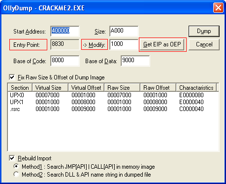 OllyDump is a plugin (.dll) which dumps the active process to an executable file (PE). Now, press F8 until it takes the jump and reaches to the address (00401000). Once there, we will use OllyDump to dump the original code. Go to Plugins->OllyDump->Dump debugged process. We will be presented with the screen shown below in Fig-5. As we can see, the Entry point was the address of the packed executable which is being modified to a new address and being assigned to the EIP register for executing the next instruction.