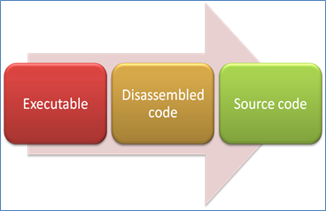 Once the exe is unpacked, we will try to analyze it and patch it. As per Wikipedia, "Reverse engineering is the process of discovering the technological principles of a device, object, or system through analysis of its structure, function, and operation." A source code is compiled to the object file and finally it's linked to the executable. The executables are purely in binary mode and not in a human friendly form – it's not human readable. So when we try to reverse the same process and bring back the executables to its object phase, which is called disassembling, it's called reverse engineering. [Fig-7]