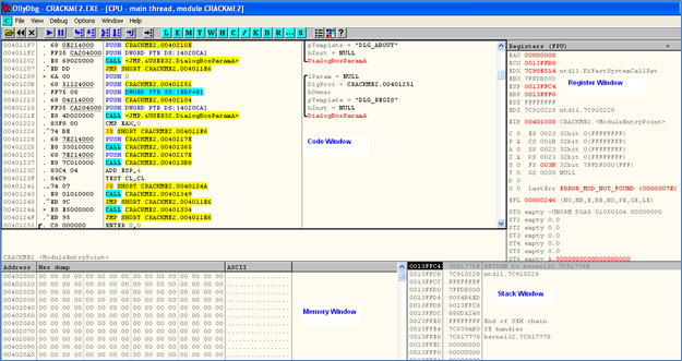 OllyDbg has four windows: Code Window-which shows assembly code of the application loaded, Register Window-shows values on each of the register, Stack Window-which shows different values loaded onto the stack at the time of execution and the Memory Dump Window. For executing instructions step by step, the F8 key is used; to run the application continuously F9 key is pressed. The F7 key is used to peek into any function and F2 is used to set a breakpoint where an application may be paused to check its behavior. There are several other options as well, but mainly only these four are used for the inspection of codes. [Fig-8]