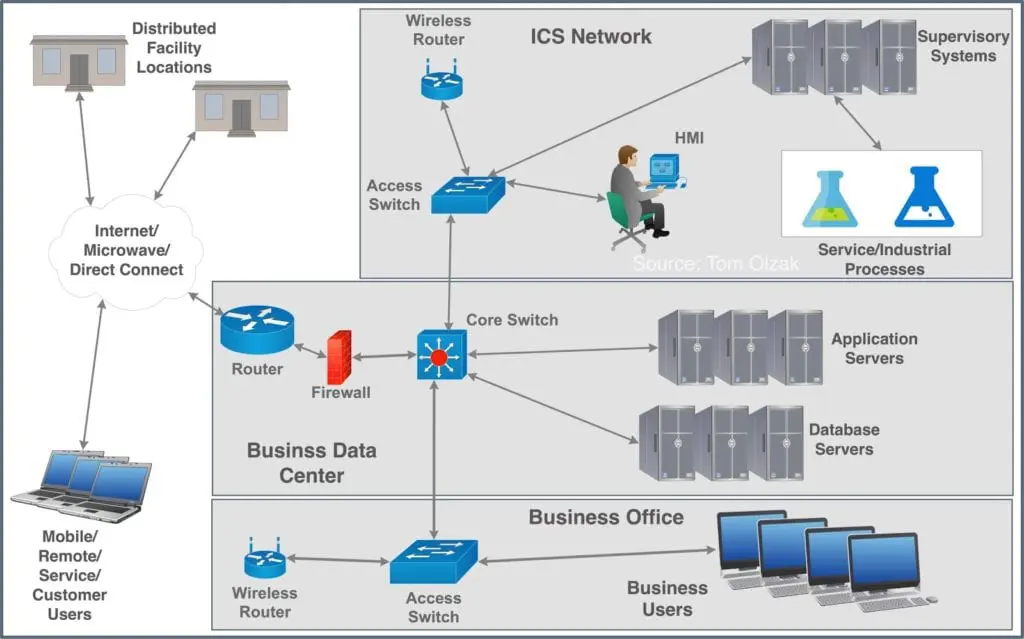 The networks are all connected via a core switch and all are potentially available to the internet. This can make the ICS and SCADA systems susceptible to cyber-intrusions started on remote or local user devices. This is a significant access control challenge associated with employees. However, this is not the biggest challenge.
