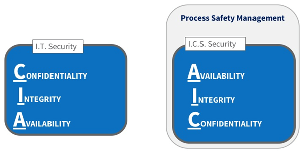 IT is more data-centric, where the key requirement is Confidentiality, Integrity and Availability (CIA). On the other hand, ICS is more concerned with Availability and Integrity. Confidentiality is the lowest priority.