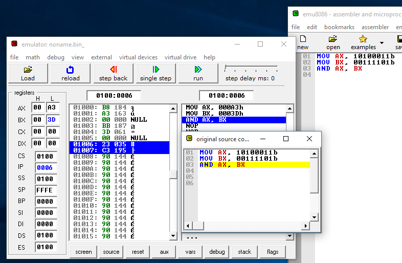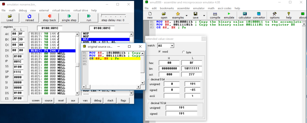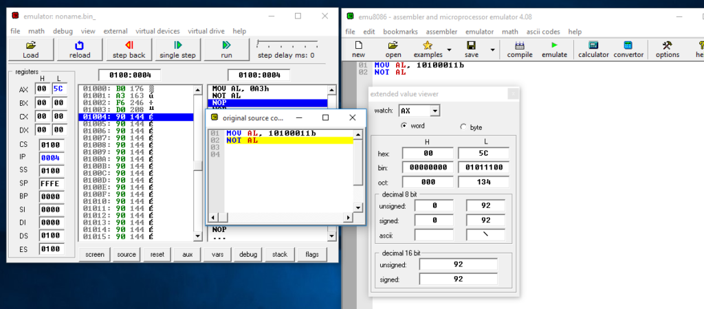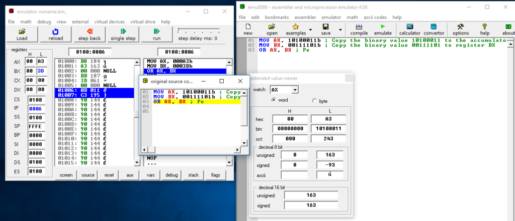 - MOV AX, 10100011b ; Copy the binary value 10100011 to the accumulator