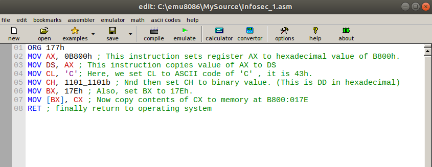 - MOV CL, 'C': Here we set CL to ASCII code of 'C', it is 43h