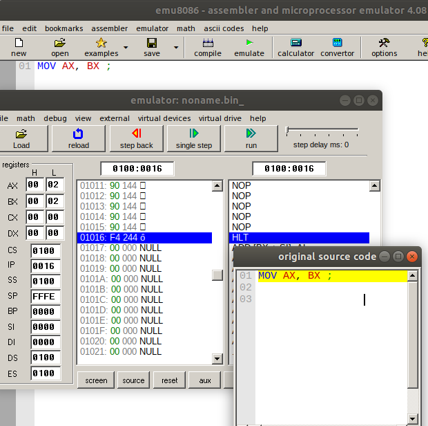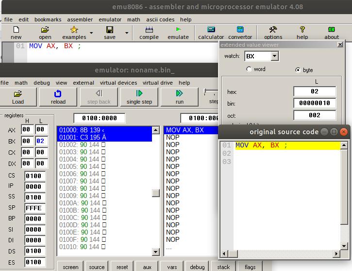 - MOV AX, BX: This instruction copies the content of register BX to AX. The new value of AX is 0x2. The source operand is BX and the destination operand is AX