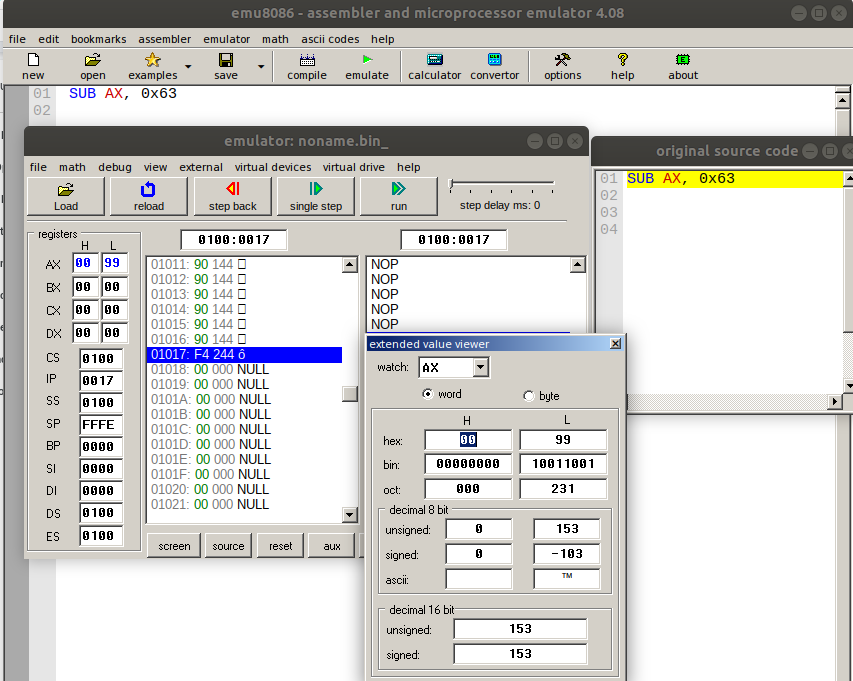 - SUB AX, 0x63: This subtracts the hexadecimal value 63 from the value stored in the accumulator. We assumed that the accumulator register AX is pre-loaded with the hexadecimal value 99