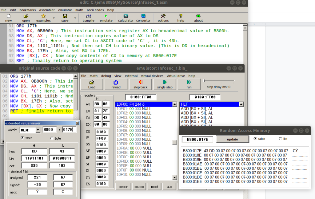 - MOV [BX], CX: Now copy contents of CX to memory at B800:017E (This will be verified after execution of the above code)