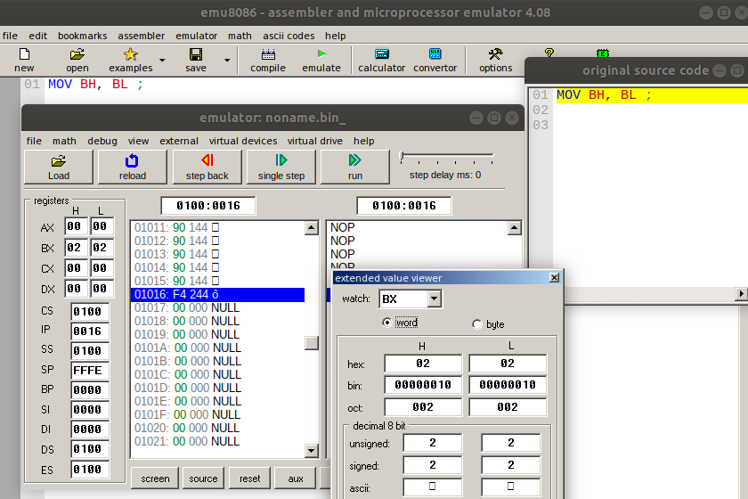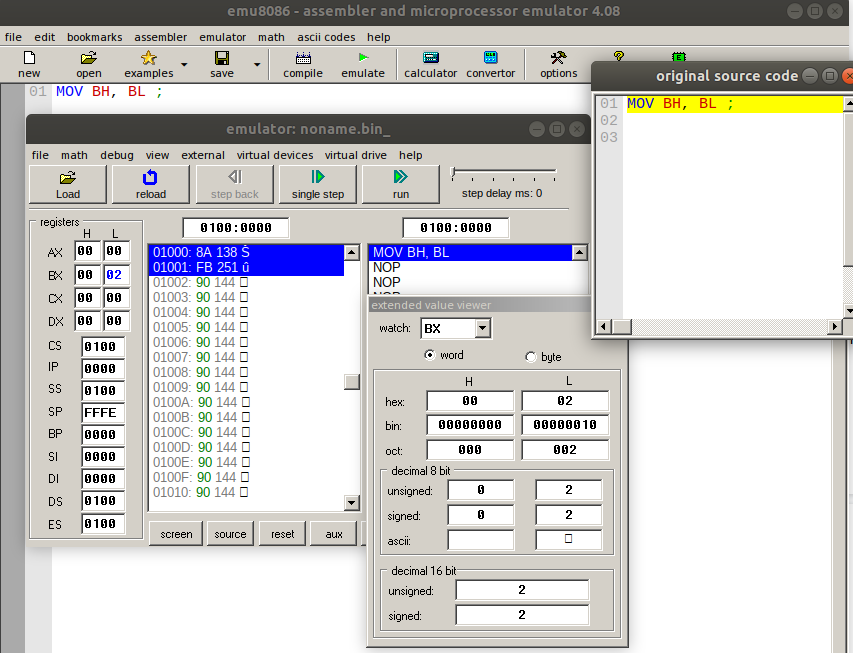 - MOV BH, BL: This instruction copies the content of register BL to BH. The new value of BH is 0x2. The source operand is BL and the destination operand is BH