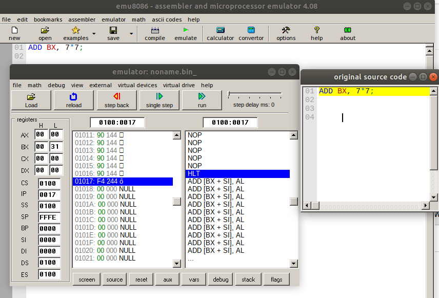 - ADD BX, 7*7: This instruction evaluates the expressions involving constants and then the resulting value is subtracted from the value in register BX. Let’s assume register BX is preloaded with the value 0x0