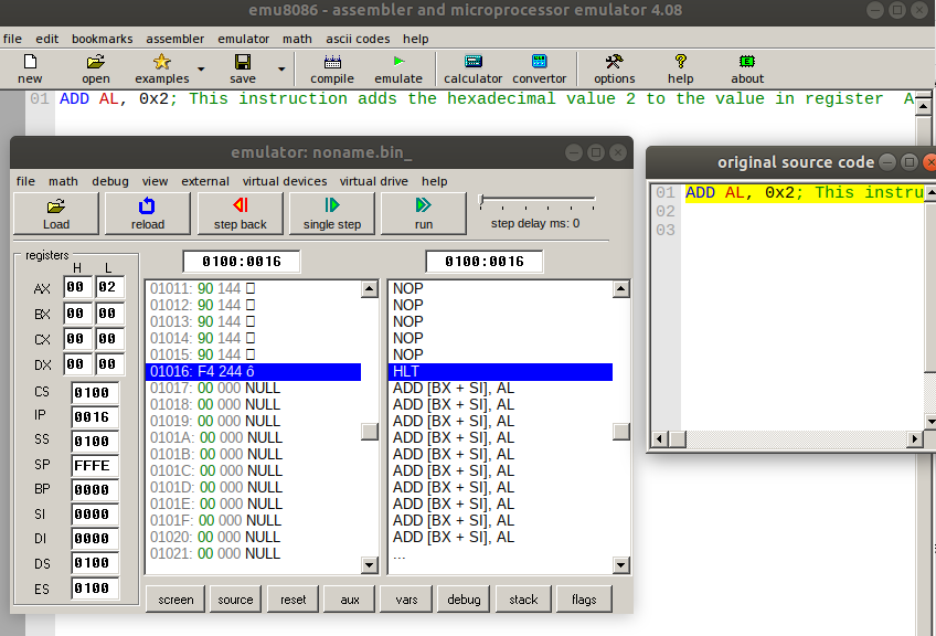- ADD AL, 0x2: This instruction adds the hexadecimal value 2 to the value in register AL and then stores the sum in AL. In this instruction, AL is the destination operand. Immediate data is never permitted in the destination operand. We also assumed the initial value of AL is 0x0