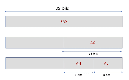 It is possible to use a 32-bit register and access the lower half of the data by the corresponding 16-bit register name. For example, the lower 16 bits of EAX can be accessed by using AX. Similarly, the lower two bytes can be individually accessed by using the 8-bit register names. For example, the lower byte of AX can be accessed as AL and the upper byte as AH. This looks as shown in the figure below.