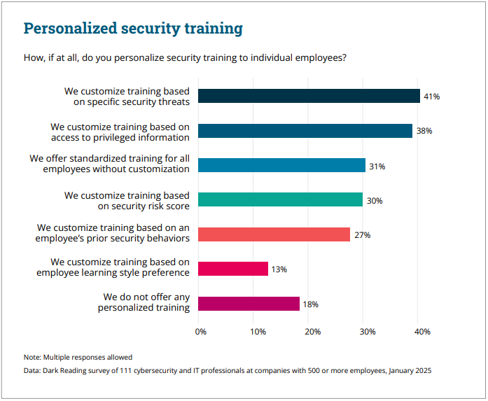Different roles face different security challenges. Executives are targets for whaling attacks, finance teams for business email compromise, and IT staff for sophisticated technical exploits. A one-size-fits-all approach completely misses these nuanced training needs. However, as we discovered in our recent human risk management report with Dark Reading, more than three out of 10 organizations use the same standardized training for all employees.