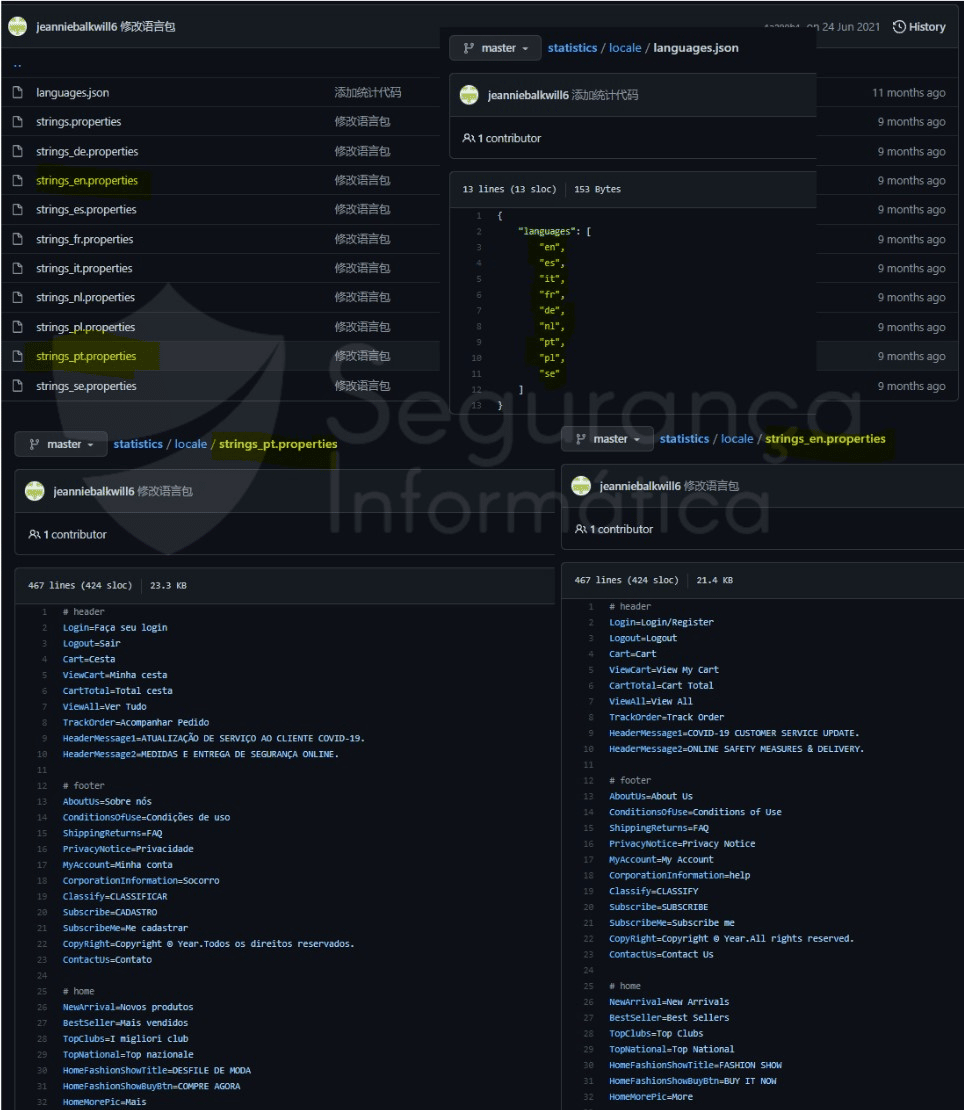 Criminals use a static CMS, and part of the source code is available on GitHub. As can be seen, many pages can be identified and matched with the pages of the online stores. The code and page names are the same — a clear sign this template is used to spawn massive campaigns in the wild.