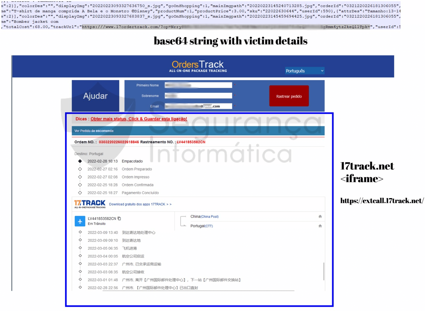 “A specific and malicious platform (17orderstrack.com) is created to control all the tracking processes. This fake platform takes advantage of the 17track.net legitimate API to exhibit the tracking details presented below,” says Segurança-Informática.