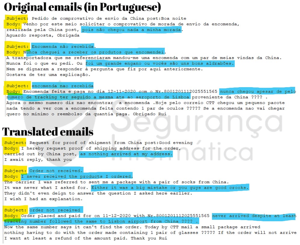 Figure 5: Emails sent by victims to the fake online stores complaining about the orders and received packages (source).