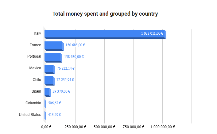 From the analysis of 227 stores, it is observed a total of 1,511,674 euros was spent by victims from different countries such as Italy, France, Portugal, Mexico, Chile, Spain, Columbia, USA and more. Italy is the most affected country, with a total of 1,033,011 euros. This reveals a significant amount of money compared to other countries — which denotes the motivation of the criminals behind the massive campaign worldwide.