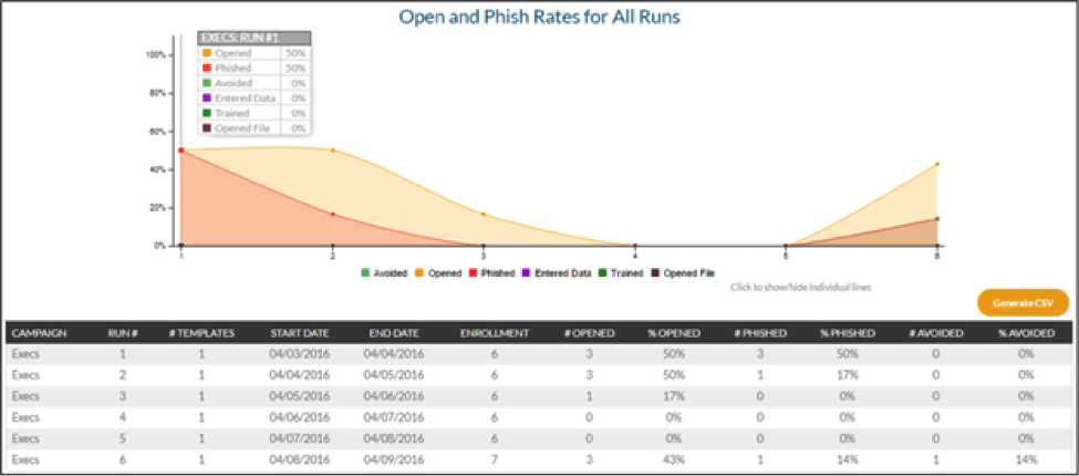 The Phish Campaign Run Status details specific actions taken by individuals. You can use this information to require them to take further training courses in the AwareEd section of SecurityIQ.
