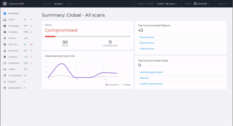 Infocyte HUNT is an agentless threat-hunting solution. Well, not completely “agentless,” as a central console installs agents on all endpoints. The good news is they only last for about one to three minutes before being dissolved, reducing the impact on analyzed hosts to this very short time period.