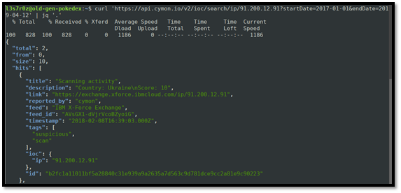 curl 'https://api.cymon.io/v2/ioc/search/ip/46.148.18.162?startDate=2017-01-01&endDate=2019-04-12' | jq '.'