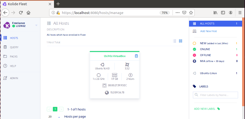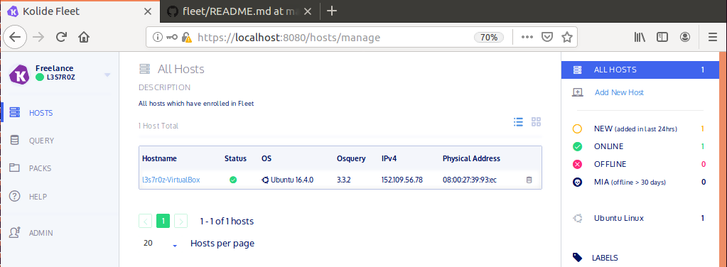 Figure 10. Kolide hosts manager dashboard with list-view online host