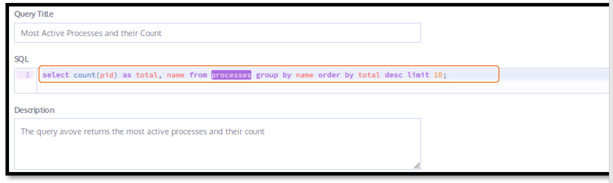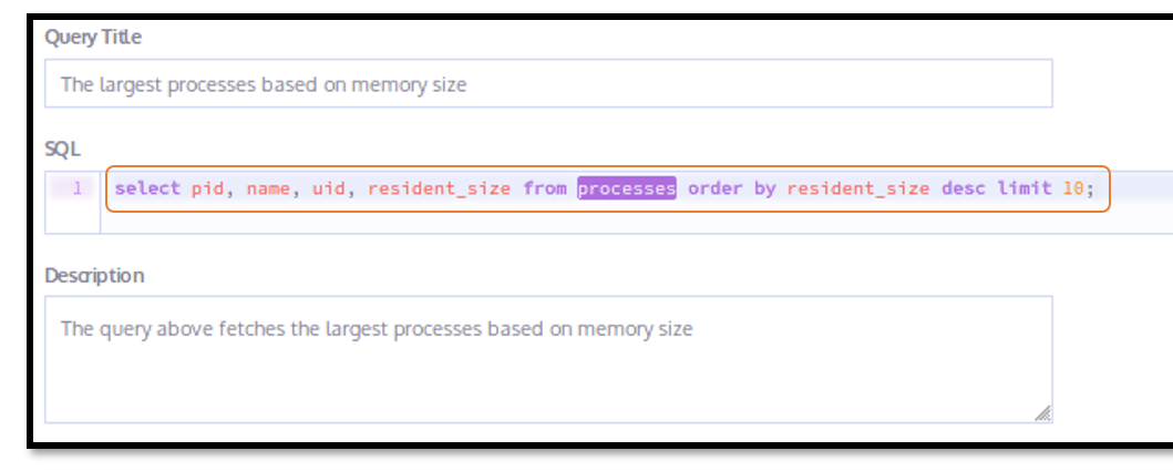 We used osquery to query for the process ID, process name and the process size in memory. We decided to limit our query to 10 responses. The following query was used: