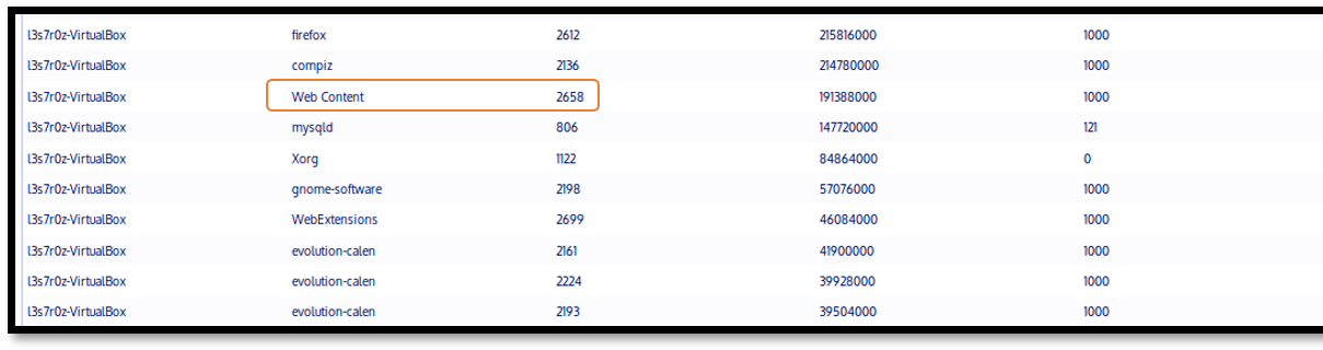 Sometimes, malware may consume heavy system resources. By way of example, we infected our system with a resource-intensive malware. The malicious process, named “Web Content,” can be seen below with the ID 2658. This process takes a significant amount of RAM, competing with more relevant processes, and ends up freezing the system.