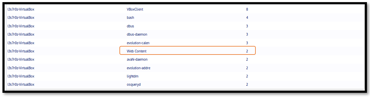 We then ran the query and received the following output. Notice the malicious process called “Web Content”: