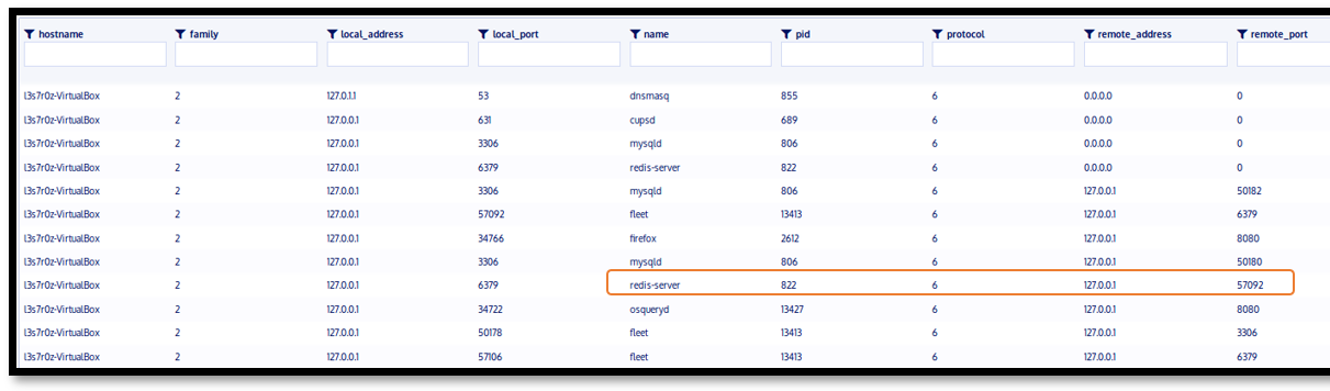 A lot of malicious software today communicates remotely with command-and-control servers on the internet. We created a malicious rogue redis-server instance on our server. In order for us to identify this rogue redis instance, we ran the following query on Kolide: