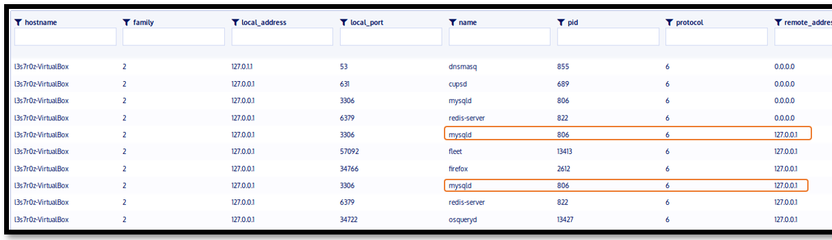 We used Kolide to identify two malicious ports that we had opened on our compromised MySQL server. In order to fool security personnel, we elevated MySQL ports from 3306 to 50180 and 50182. You can, however, use Kolide to detect this behavior by analyzing suspicious ports and outbound connections using the following command: