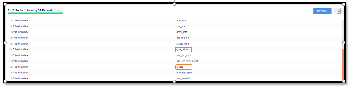 We infected our two kernel modules, “glue_helper” and “cryptd,” with rootkits and were able to identify them using Kolide. We made use of the following command: