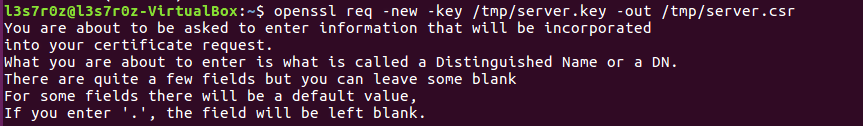 In the step below, we generate a certificate signing request file. The command and output are shown below: