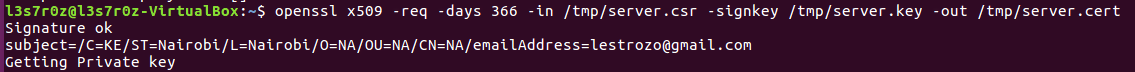 In this step we are generating the signed certificate. The command and output are shown below:
