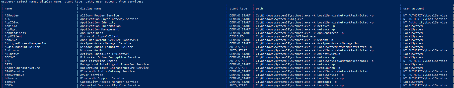 select name, display_name, start_type, path, user_account from services;