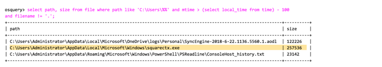 We can use osquery to identify the malware executable dropped within the “Users” directory (in the last 100 seconds), using a similar command to the one we used above. We did not infect our system, but the command which can be used for this is shown below: