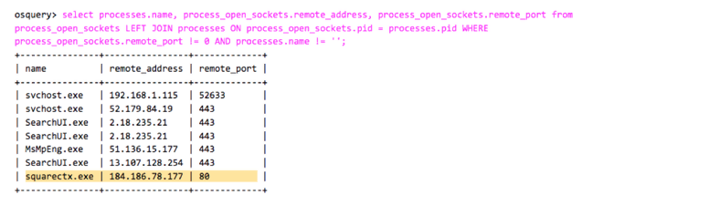 The query above shows the JOIN statement we used between the process_open_socket and processes tables. As can be seen, PowerShell connects to two remote IPs at port 80.