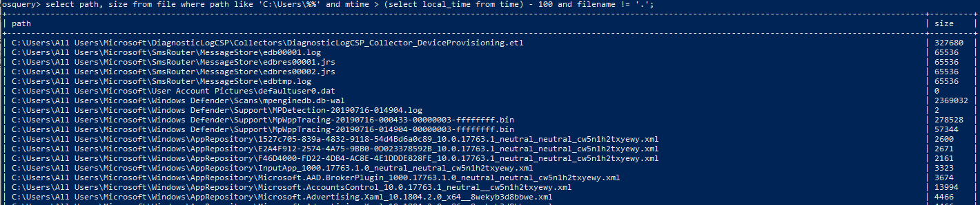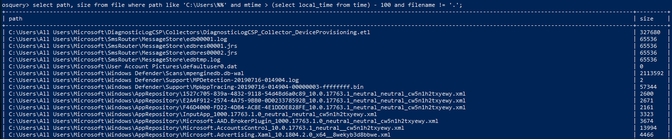 select path, size from file where path like 'C:Users%%' and mtime > (select local_time from time) - 100 and filename != '.';